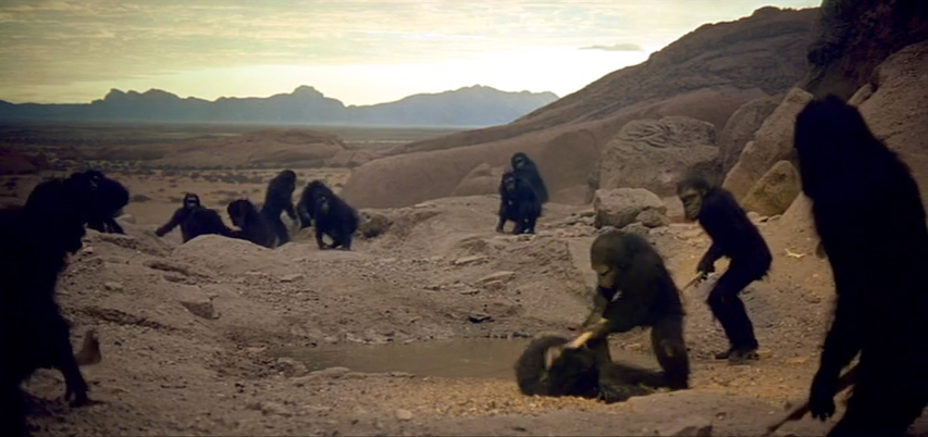 As if hunger were not bad enough, the apes face predators. One particularly fierce leopard, is depicted roaming the landscape killing apes. And, to make matters worse, another small tribe of apes battles Moonwatcher and his band over a crucial water hole only feet wide. The discerning viewer must conclude that here is a species wholly unsuited to the environment these apes inhabit. Moonwatcher and his tribe cling to life by but a thread, with extinction looming and ever present.