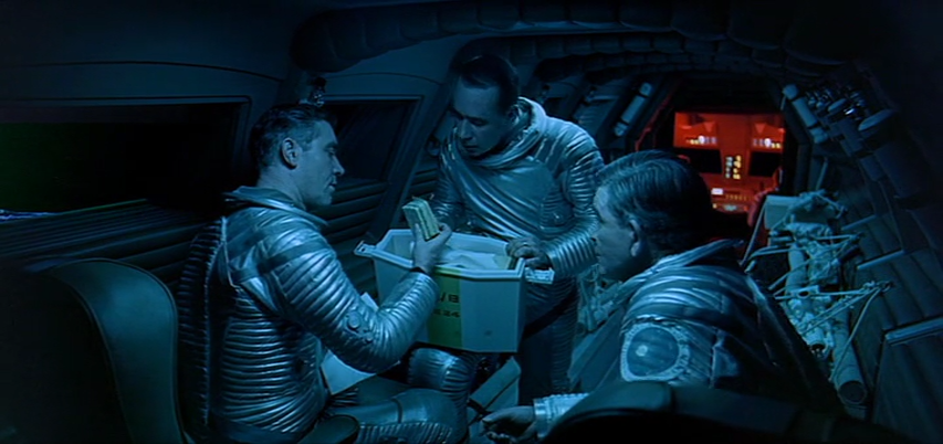 On board this ship we see Floyd and two cohorts from the meeting chit-chatting irrelevant banter. Dressed in space suits, one takes a container containing square artificial sandwiches wrapped in cellophane, which look to have the consistency of soft crackers with a dollap of creamed liverwurst squirted inside. They seem less appealing than unsavory Twinkies, and yet the group jokes about how much 'better' the food has gotten over time. As they eat, one verbally back-slaps Floyd, telling him that he's really improved base morale with his shut-the-fuck-up-and-do-what-we-say speech. They're only too happy to oblige to the demands of the leadership council Floyd represents. In both cases, the unsavory food and ridiculous submission to blind authority suggests more than mere lying to Floyd, but self deception as well.