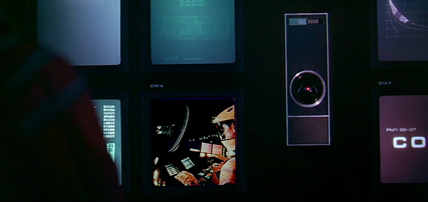 But who is the prison guard on board this ship? This question isn't answered, but rather implied by the divisions of gaze between its inhabitants: HAL's gaze of his crew mates, the crew mates gaze upon themselves in the news report as they express an implied sense of self-superiority, and the camera's relatively objective gaze upon them. The crew do not react to the fourth wall of the camera, but they do react to HAL's gaze as the computer reacts to theirs, thus creating a kind of ship-wide panopticon where everyone's gaze polices everyone else's. Whom takes on the role of guard is thus situational. Bowman, as mission commander, takes input from his superiors on what may be said to a reporter. HAL has an implied position of power as an overseer managing ship life-support systems.